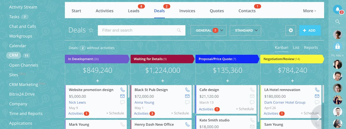 - CRM: Advanced (Custom fields for leads/deals/Contacts/Companies, statuses for leads/deals);